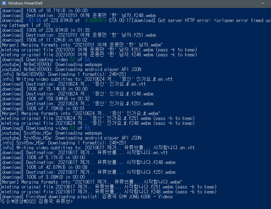 ./yt-dlp --yes-playlist --write-sub -f 'bestvideo+bestaudio' https://www.youtube.com/c/GYMJONGKOOK/videos -o "%(upload_date)s %(title)s"